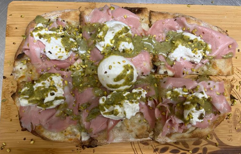 Mozzarella, pesto di pistacchi, mortadella, burrata, granella di pistacchi
