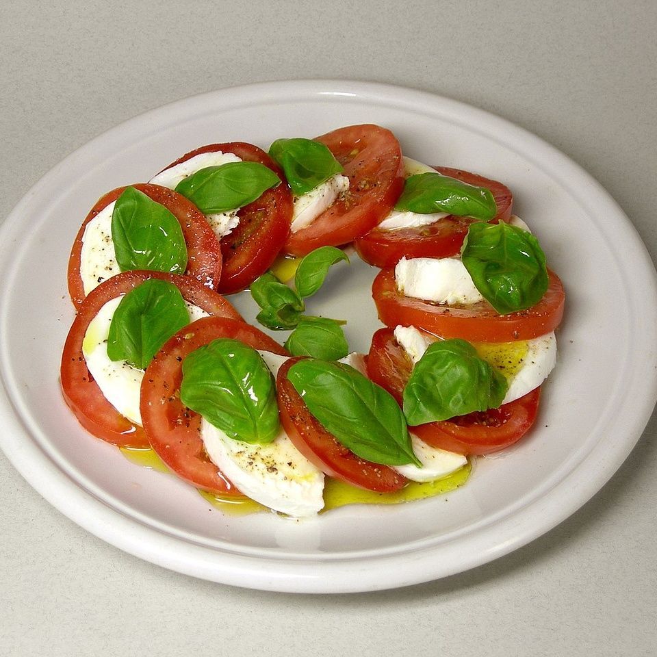 Pomodoro fresco a fette, mozzarella fresca a fette, basilico fresco